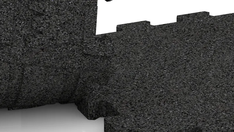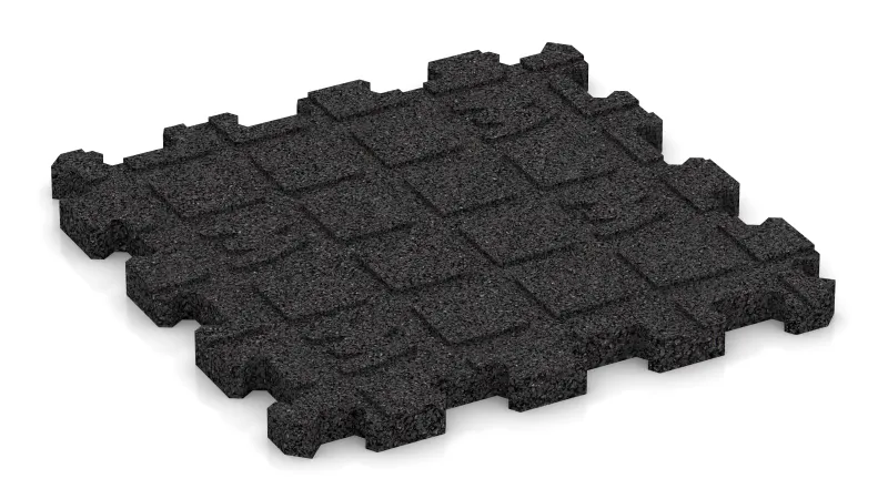 Chaque carreau est fabriqué à partir de granulats de caoutchouc liés au polyuréthane. De grands blocs sont pressés, laissés reposer puis découpés avec une grande précision. Ce procédé permet d’obtenir des carreaux calibrés aux dimensions exactes et à la finition homogène – un atout lors de la pose et pour l’esthétique finale.