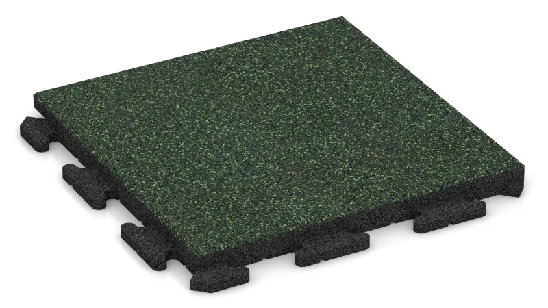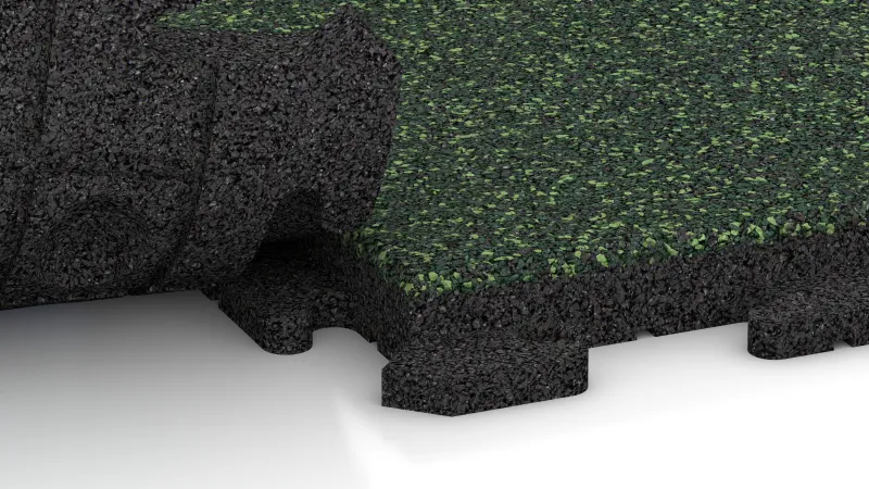 Chaque dalle est fabriquée en granulats de caoutchouc ELT liés au polyuréthane, issus du recyclage de pneus usagés. Une version avec une surface colorée en granulats d’EPDM, entièrement pigmentés et résistants aux UV, est également disponible. Les deux variantes sont élastiques, robustes et écologiques. La surface est antidérapante, amortissante et totalement perméable à l’eau : l’eau de pluie s’infiltre naturellement dans le sol, préservant la perméabilité et la vitalité du terrain.