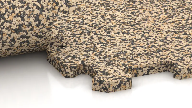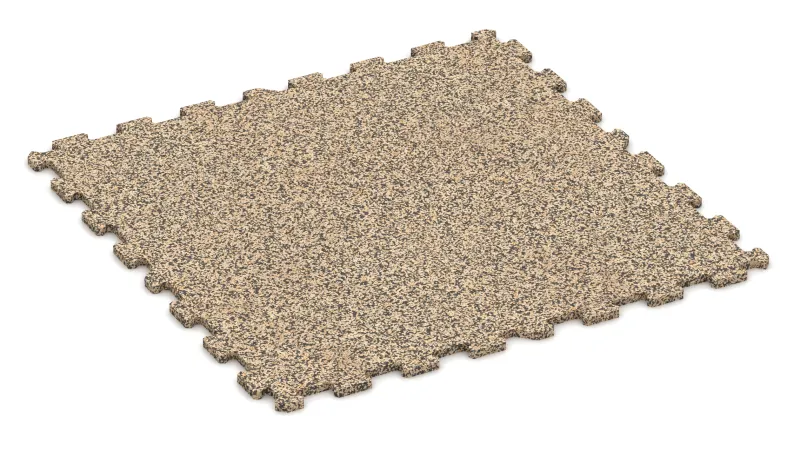 Chaque carreau est fabriqué à partir de granulats de caoutchouc liés au polyuréthane. De grands blocs sont pressés, laissés reposer puis découpés avec une grande précision. Ce procédé permet d’obtenir des carreaux calibrés aux dimensions exactes et à la finition homogène – un atout lors de la pose et pour l’esthétique finale.