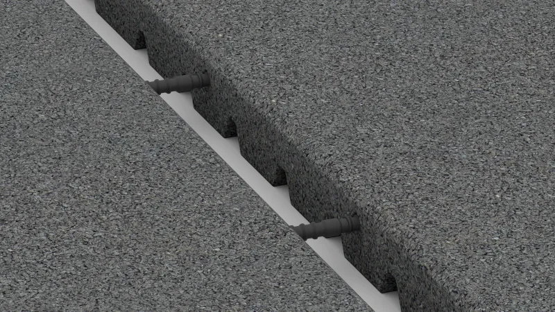 Sur des supports solides comme le béton ou l’asphalte, les dalles peuvent être collées ponctuellement ou en plein avec une colle PU mono-composant. Une liaison collée entre les dalles – notamment en périphérie – renforce la stabilité de l’ensemble. Les dalles d’angle ou de rampe doivent toujours être collées lorsqu’elles reposent sur un support rigide.